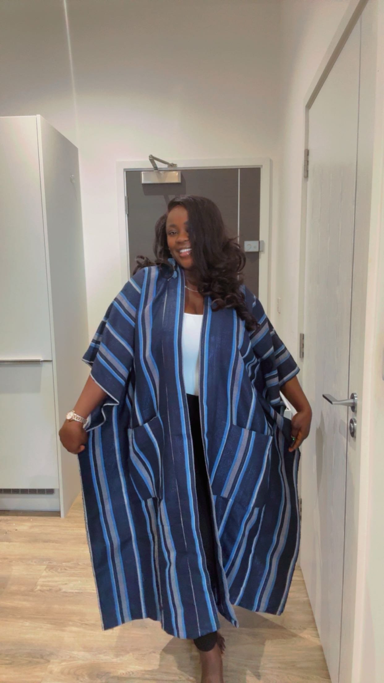 A beautifully crafted kimono made from fine blue aso oke fabric, featuring rich woven patterns. The detailed pattern gives it an elegant, regal feel, making it perfect for special occasions and celebrations.