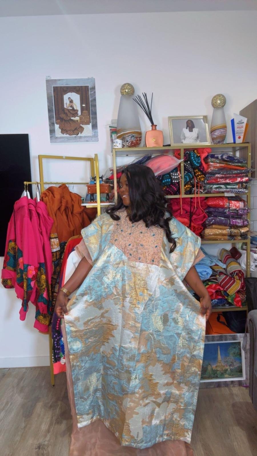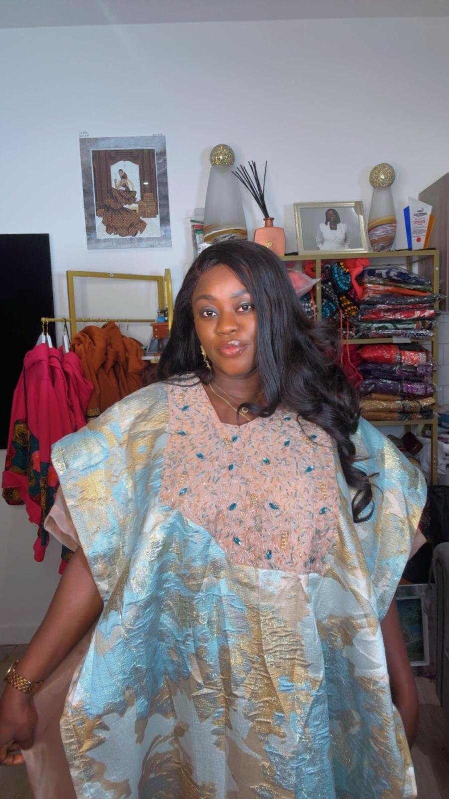 A gorgeous Blue and Gold Brocade Bubu Gown in a stunning mix of sky blue, gold and cream tones with a beautiful abstract floral brocade pattern. The wide flowing style and shimmering fabric give it a luxurious and glamorous finish that commands attention.