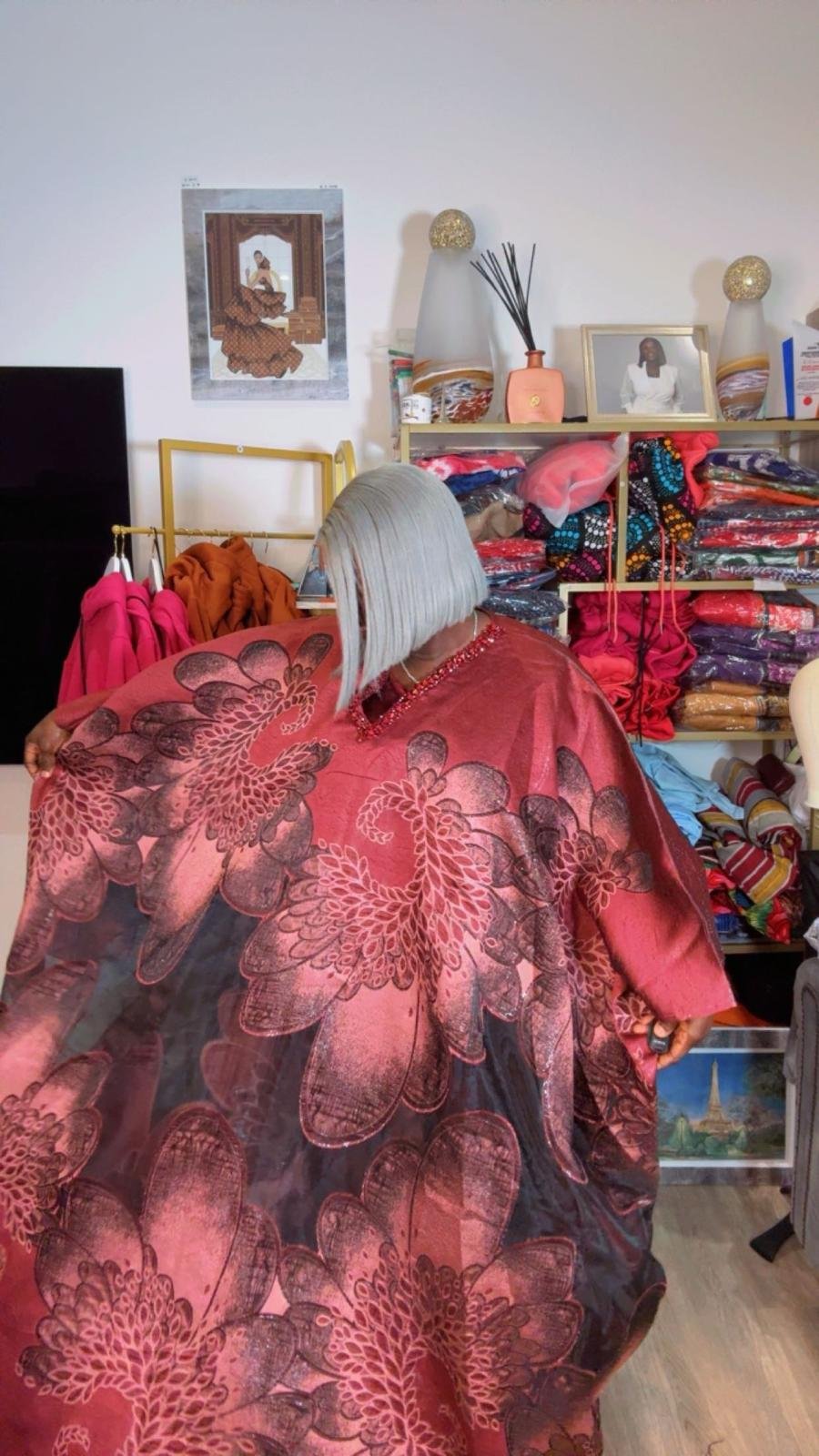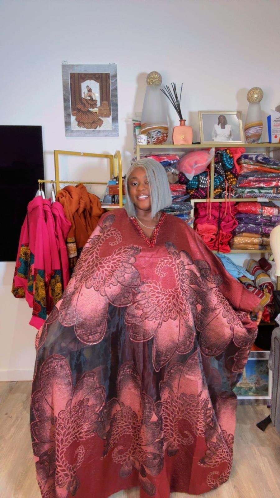 A stunning, dramatic evening gown in deep crimson and burgundy tones, exuding luxury and opulence.